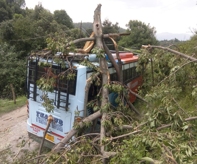 जिला मंडी के गोहर क्षेत्र में सड़क किनारे खड़ी बस पर तूफान के कारण पेड़ गिर गया। इस कारण बस काफी क्षतिग्रस्त हो गई है। गोहर क्षेत्र में भी भारी नुकसान हुआ है।